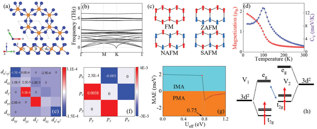 图1 (a) VI3结构; (b) 声子谱; (c) 铁磁及Neel、Zigzag和Stripe反铁磁配置; (d) 温度与磁矩、比热容关系图;Ueff = 0ev时V-d (e)、I-p (f)轨道MAE图; (g) MAE随Ueff变化曲线; (h) V-3d轨道分裂图