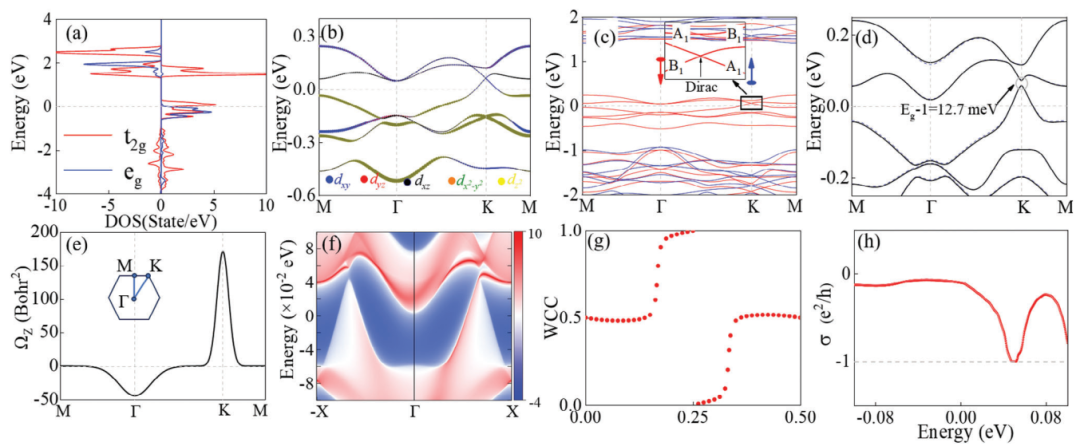 图2 (a) V-d轨道DOS; (b) V-d能带图; (c) VI3能带图; (d) SOC下能带结构; (e) Berry曲率; (f) 边缘光谱; (g) VI3单层WCC演化图;(h) AHC演化图