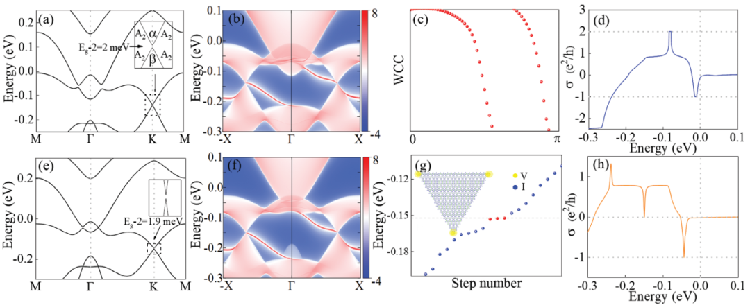 图3a显示了Ueff =0.85eV时,VI3单层能带结构,附近有2 meV带隙 Eg-2。通过计算LBCs(Linear band crossings)的IRRs(Irreducible representations)发现,α带属于K6,而β带属于K5;K点附近两个带的IRR值均为Α2,证明带隙Eg-2存在。为了验证拓扑性质,图3b、f分别显示了Ueff =0.85eV和0.96 eV时,VI3在能量范围为0.1-0.25 eV的Zigzag边缘光谱。两个手性边缘态在Ueff =0.85eV处连接了|C|=2的两个能带,验证了非平凡拓扑带隙存在,WCC能进一步证明(图3c)。图3f,Ueff =0.96eV时,在体带隙每个边种存在一个间隙较小的边缘态。两个手性边缘态不连接两个体带(α和β),表现出SOTI特征。图3g中,EF≈0.15eV处C3对称性下观察到三个连续简并能态(红色点),三个能态的波函数很好地定域在三角形纳米片的三个顶点处,切纳米片内几乎没有波函数分布,这强烈表明VI3单层中存在SOTI态。