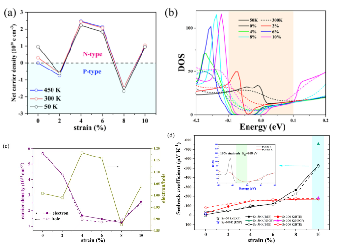 图3 (a) 净载流子密度;(b) 折叠相应费米-狄拉克分布函数的温度依赖的态密度(DOS);(c) 室温下电子/空穴浓度及比值;(d) 沿Y方向拉伸应变下单层Td-WTe2的塞贝克系数影响