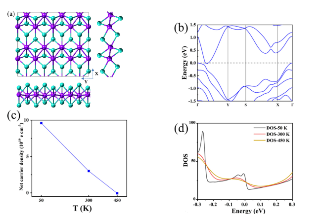 图1 (a) Td-phase WTe2结构;(b) 能带结构;(c) 净载流子密度;(d) 平滑态密度(DOS)