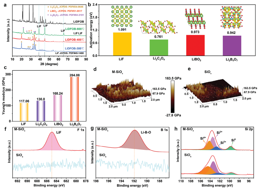 图1 表征:(a) LIDFOB不同温度下分解产物的XRD图像; (b) LiF、Li2C2O4、LiBO2和Li2B4O7的迁移活化能;(c) LiF、Li2C2O4、LiBO2和Li2B4O7的理论杨氏模量; (d) M-SiOx粉末杨氏模量;(e)SiOx 粉末杨氏模量; M-SiOx和SiOx的 (f) F 1s XPS、(g) B 1s XPS、(h) Si 2p XPS光谱