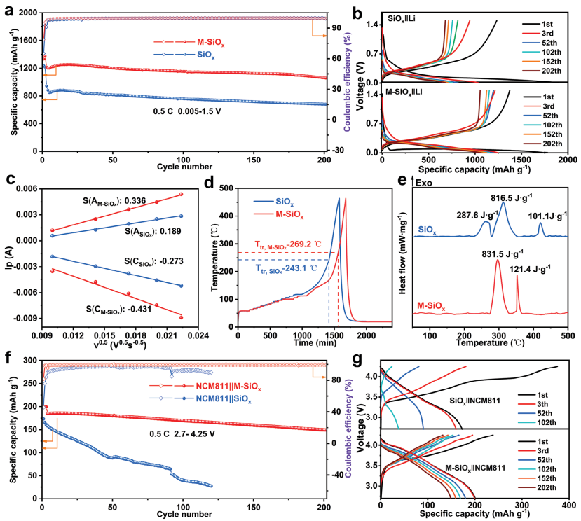 图2 (a) M-SiOx和SOx在0.1 C、0.5C下循环的半电池性能; (b)M-SiOx |Li和|Li充放电曲线;(c) M-SiOx和SOx的峰电流(Ip)与扫描速率平方根(V0.5)的关系; (d) 满电态M-SiOx和SOx的ARC测试;(e)DSC曲线; (f)NCM811M-SiOx和NCM811SOx在0.1 C、0.5 C下循环全电池性能及(g) 充放电曲线