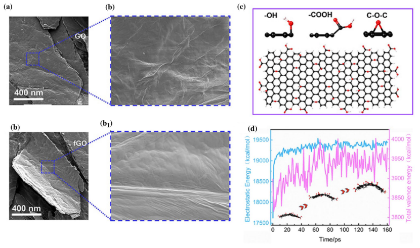 图2 (a-b) GO和fGO的SEM图像;(c) GO原子模型;(d) fGO的静电能和总价能随时间变化曲线