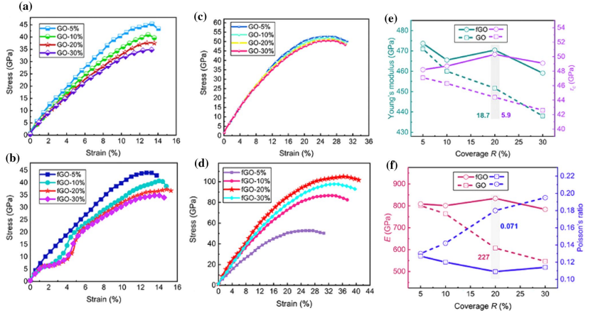 fGO的应力-应变曲线呈微弱线性增长(ε=2~4%),可能是fGO的拱形UB(单元体)结构受到拉伸所致。