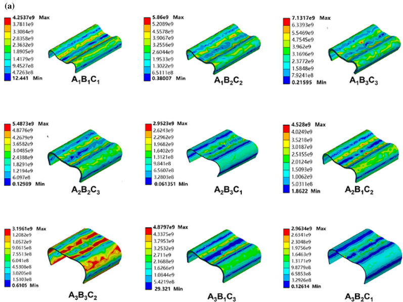图5 (a) 不同设计因素下单元体在压缩方向的等效力分布;(b) 冲击平均应力评价指标趋势