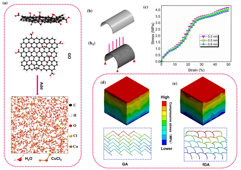 石墨烯气凝胶(GA)是一种具有三维结构的石墨烯材料,具有高导电性、高电化学稳定性、超轻、超弹性等特点。由于其多孔性和低密度,GA的力学性能受限,制造高机械强度的GA仍是一个挑战。研究人员受折纸理论的启发,已成功制备了具有拱形形态的折叠氧化石墨烯气凝胶(fGA)。然而,折叠氧化石墨烯(fGO)的自折叠机制和层间界面的增强机制一直难以解释。本案例中,研究人员采用多尺度模拟方法,先利用分子动力学(MD)从微观尺度上研究石墨烯折叠机理及微观结构对机械性能影响,在此基础上,对样品的宏观力学行为进行研究。研究发现fGA结构受应力作用时,各层间的连接点变的更紧,气凝胶的强度和抗变形能力变强,使结构更稳定。