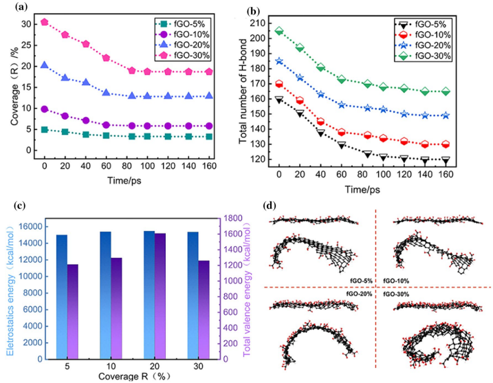 模拟结果表明:1)氧化石墨烯折叠过程中,GO表面上官能团与H2O、CuCI2发生了反应。GO反应后氢键总数减少,说明CuCI2在GO折叠过程中起了引导作用。2)折叠程度排序为:fGO-5% < fGO-10% < fGO-30% < fGO-20%。3)随着含氧官能团数量增加,折叠收到阻碍(fGO-30% < fGO-20%);过度弯曲引发氢键,导致金属离子配位相互作用减弱,从而阻碍折叠。
