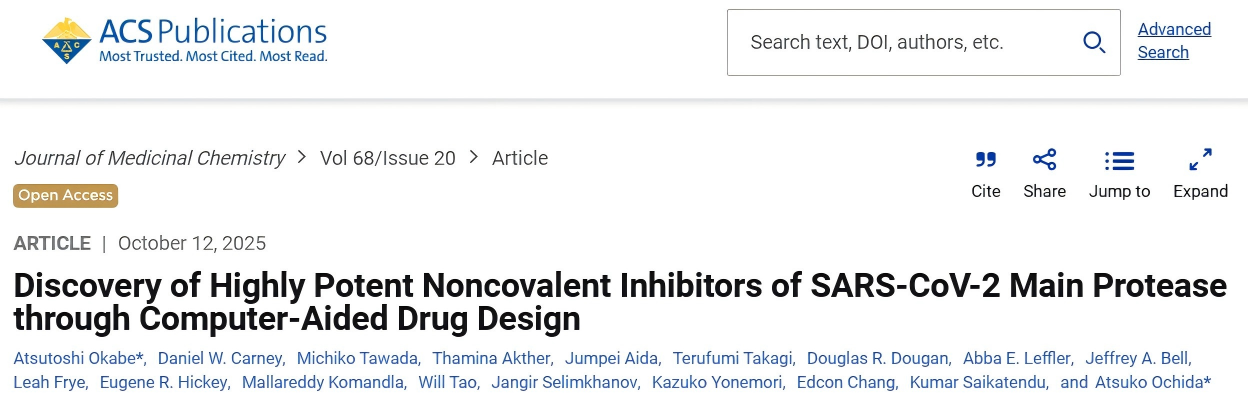 Okabe, Atsutoshi, et al. "Discovery of Highly Potent Noncovalent Inhibitors of SARS-CoV-2 Main Protease through Computer-Aided Drug Design." Journal of Medicinal Chemistry (2025).