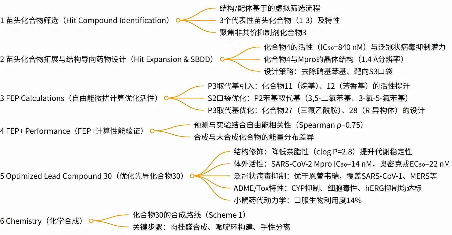 研究人员通过虚拟筛选识别出了一种以哌嗪为核心的非共价命中化合物。基于结构指导的骨架变形产生了一种新型三取代哌啶核心结构。在考虑Met49/Met165和Gln189诱导契合的条件下,通过FEP指导设计,成功筛选出强效的化合物30。该化合物不仅具有泛冠状病毒Mpro抑制活性,还对SARS-CoV-2奥密克戎变异株展现出细胞抗病毒效力。