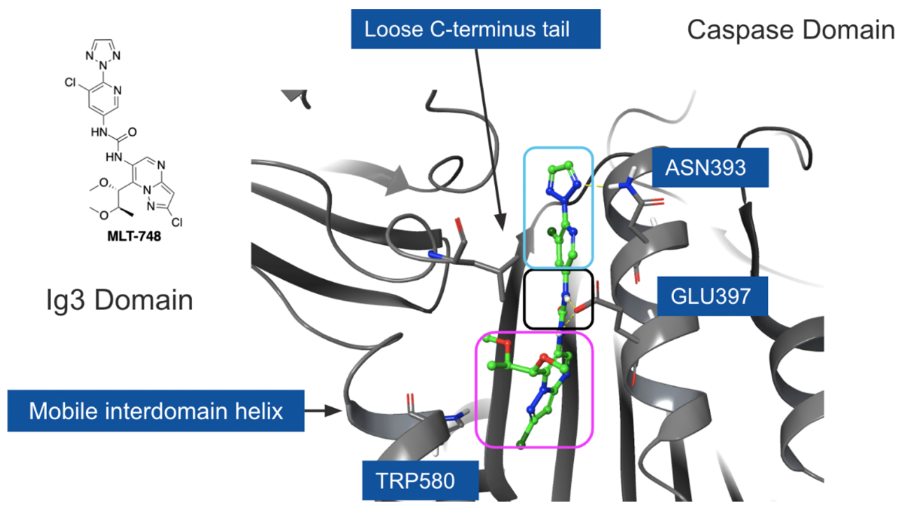 药物研发的核心挑战在于兼顾对目标靶点的亲和力,以及理想的物理化学性质。此前已有公司开发出MALT1别构抑制剂MLT-748,其与MALT1形成的共晶结构如下图所示(由Schrödinger平台的Protein Preparation Workflow构建而成)。结合口袋是一个狭窄的疏水性通道,位于半胱天冬酶结构域与Ig3结构域的交界处。基于此,如何设计出高活性、高选择性且可口服的MALT1别构抑制剂呢?