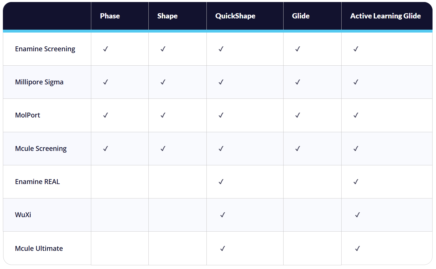 Schrödinger(薛定谔软件)已与Enamine、MilliporeSigma、MolPort、药明康德(WuXi)及Mcule达成合作,提供涵盖片段分子、类先导化合物、类药物前体及类药物分子的化合物数据库,化合物数量从数百万到数十亿不等,覆盖广阔的化学空间。这些库可以直接对接各类基于结构和基于配体的虚拟筛选技术(如下图)。