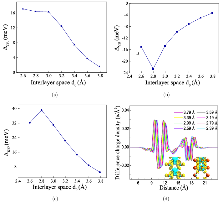 图4 不同层间距d0下VI3 / WSe2异质结:(a) 导带CB;(b) 价带VB; (c) 总谷极化;(d) 电荷密度