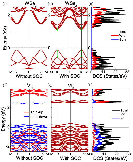 图1 (a) WSe2结构; (b) VI3结构; (c-e) WSe2和 (f-h) VI3单层的能带结构及DOS