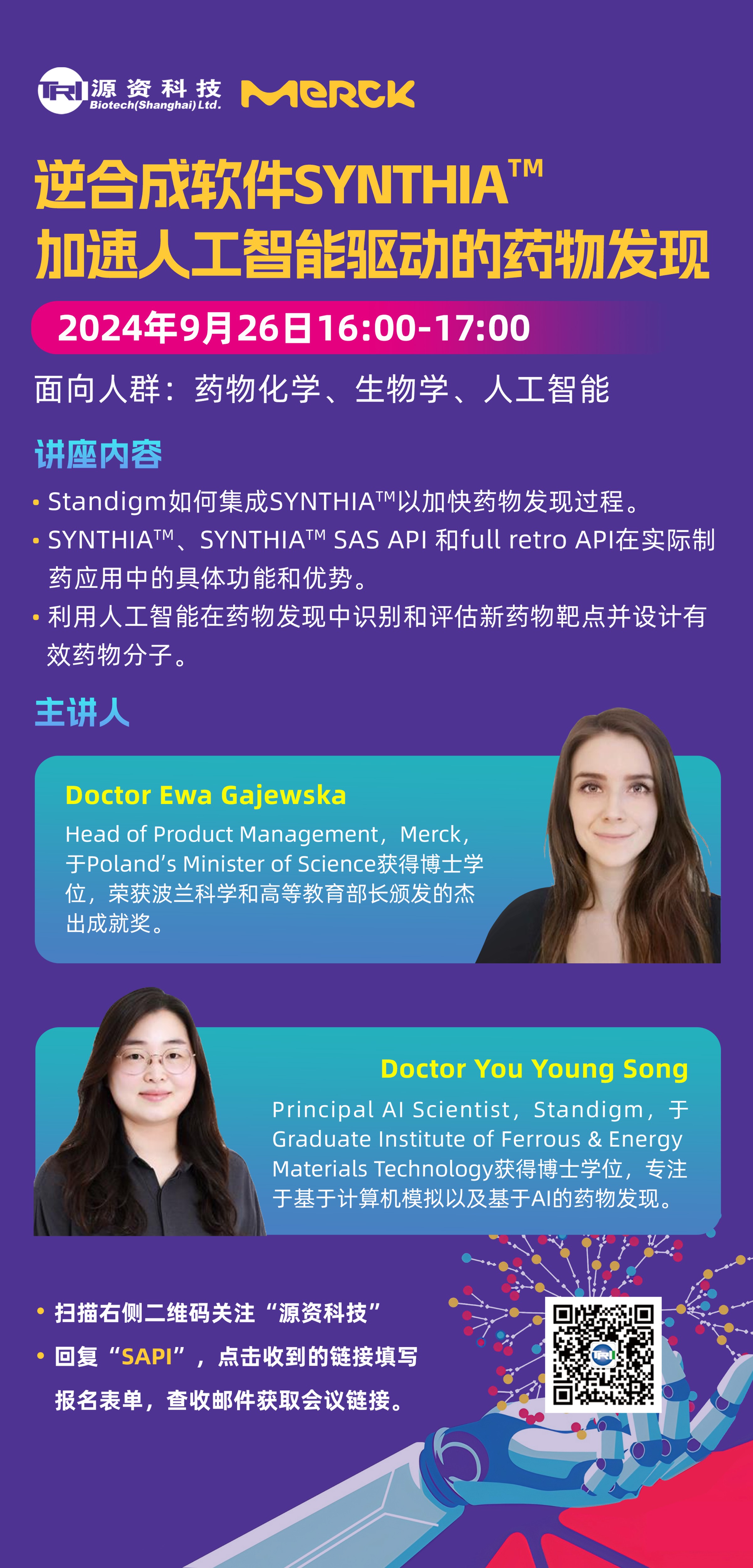 Standigm(韩国AI驱动药物发现公司)首席 AI 科学家You Young Song携手默克SYNTHIAᵀᴹ产品经理Ewa Gajewska于9月26日和您共同探讨AI在制药领域如何高效地驱动药物研发。