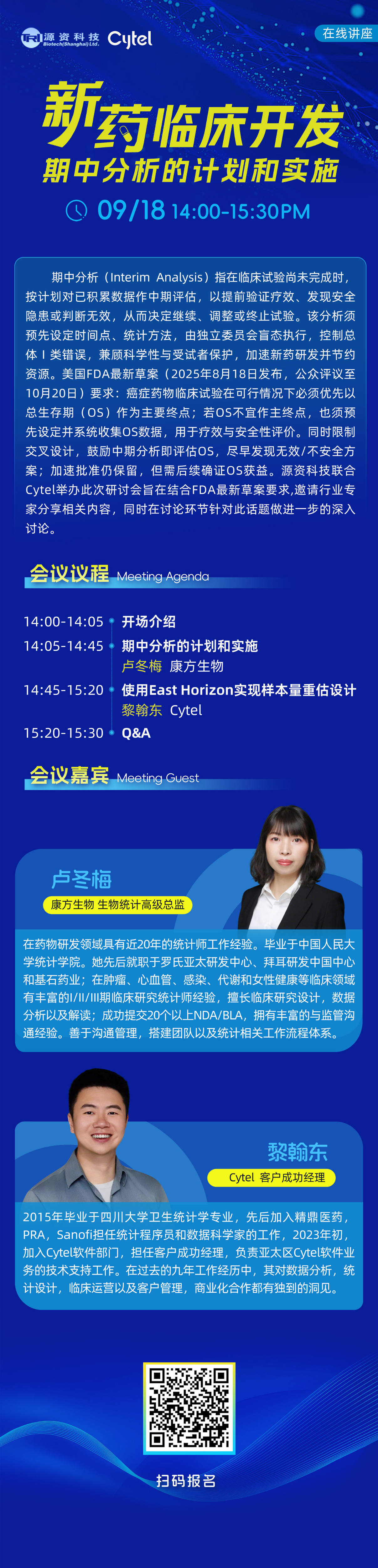 9月18日直播,源资科技联合Cytel举办此次研讨会旨在结合FDA最新草案要求,邀请行业专家分享相关内容,同时在讨论环节针对此话题做进一步的深入讨论。