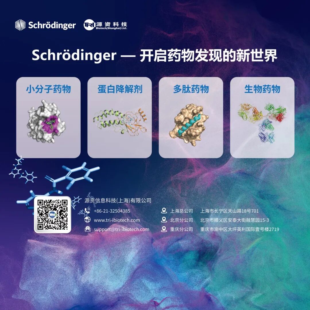 本次大会将通过会议报告、专题研讨等多元形式,解析药物研发前沿趋势。源资科技将携手AI制药知名企业Schrödinger重磅亮相,以“计算赋能新药创制”为核心理念,带来技术与实践的深度融合方案。依托AI与生物医学大数据技术,源资科技将现场分享新靶点挖掘、化合物优化等关键环节的高效解决方案,助力科研工作者突破研发瓶颈。