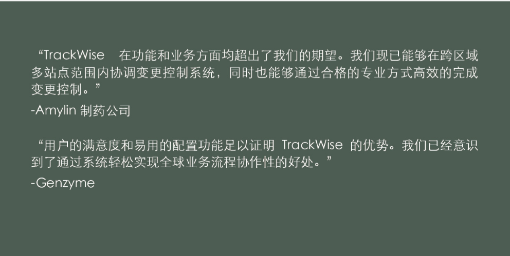 TrackWise质量管理是制药行业的优质解决方案,符合行业严格监管标准,被企业的质量管理、制造和监管事务专业人士用于管理合规性、降低风险和提高安全性。