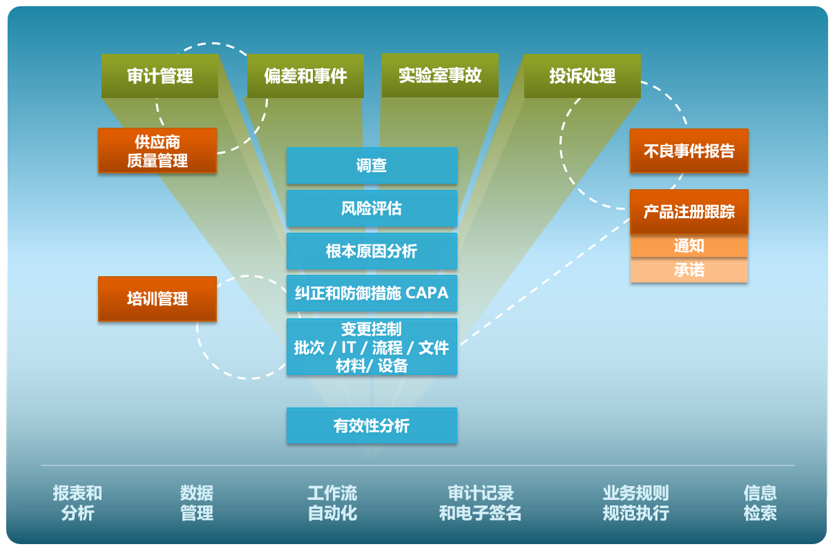 通过跨所有质量流程的集中统一管理、报告和高级分析,用户可以利用质量数据来加强其质量文化、提高效率、提高质量、实现法规遵从性和降低风险,并最终影响整个公司的绩效。