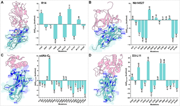 图注:预测四种纳米体结构的突变位点和结合亲和力变化
