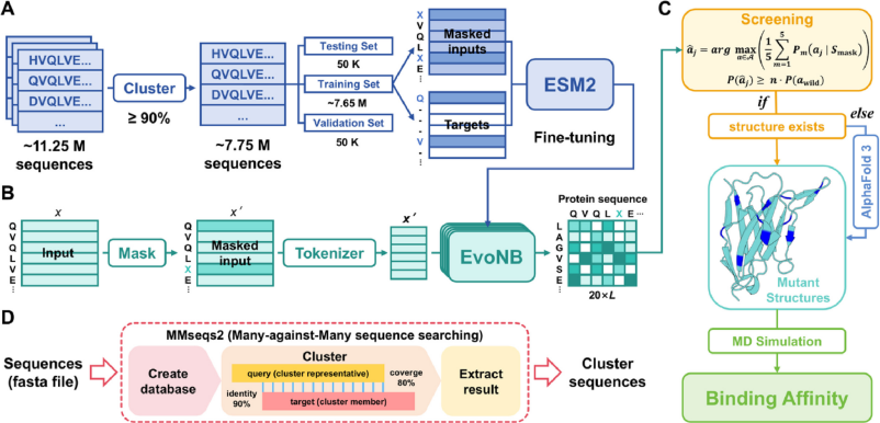 EvoNB(Evolutionary Nanobody)是一项融合AI深度学习与分子动力学模拟的创新技术方案,核心目标是精准预测纳米抗体突变并优化其功能特性。它将蛋白语言模型与分子动力学模拟相结合,大幅提升了纳米抗体的优化效率,为抗体药物设计和精准医疗提供了强有力的计算工具。